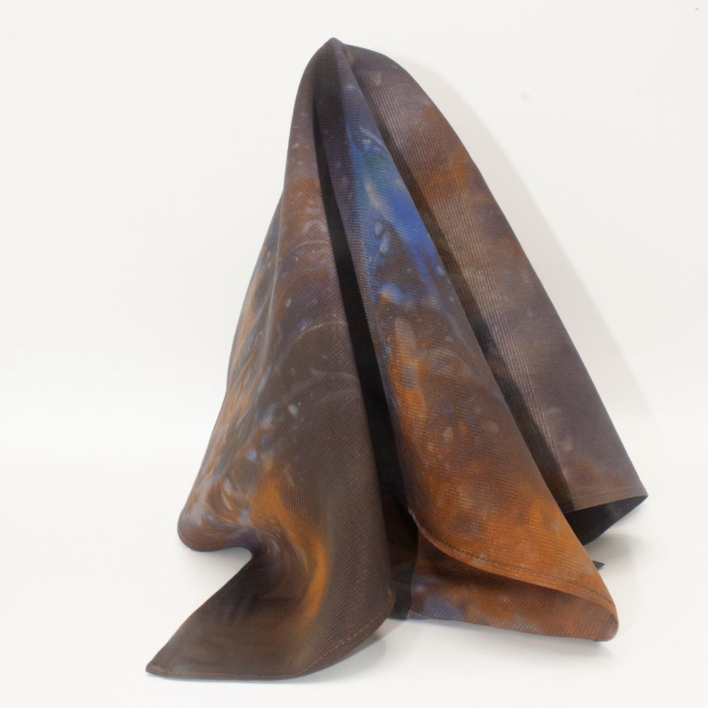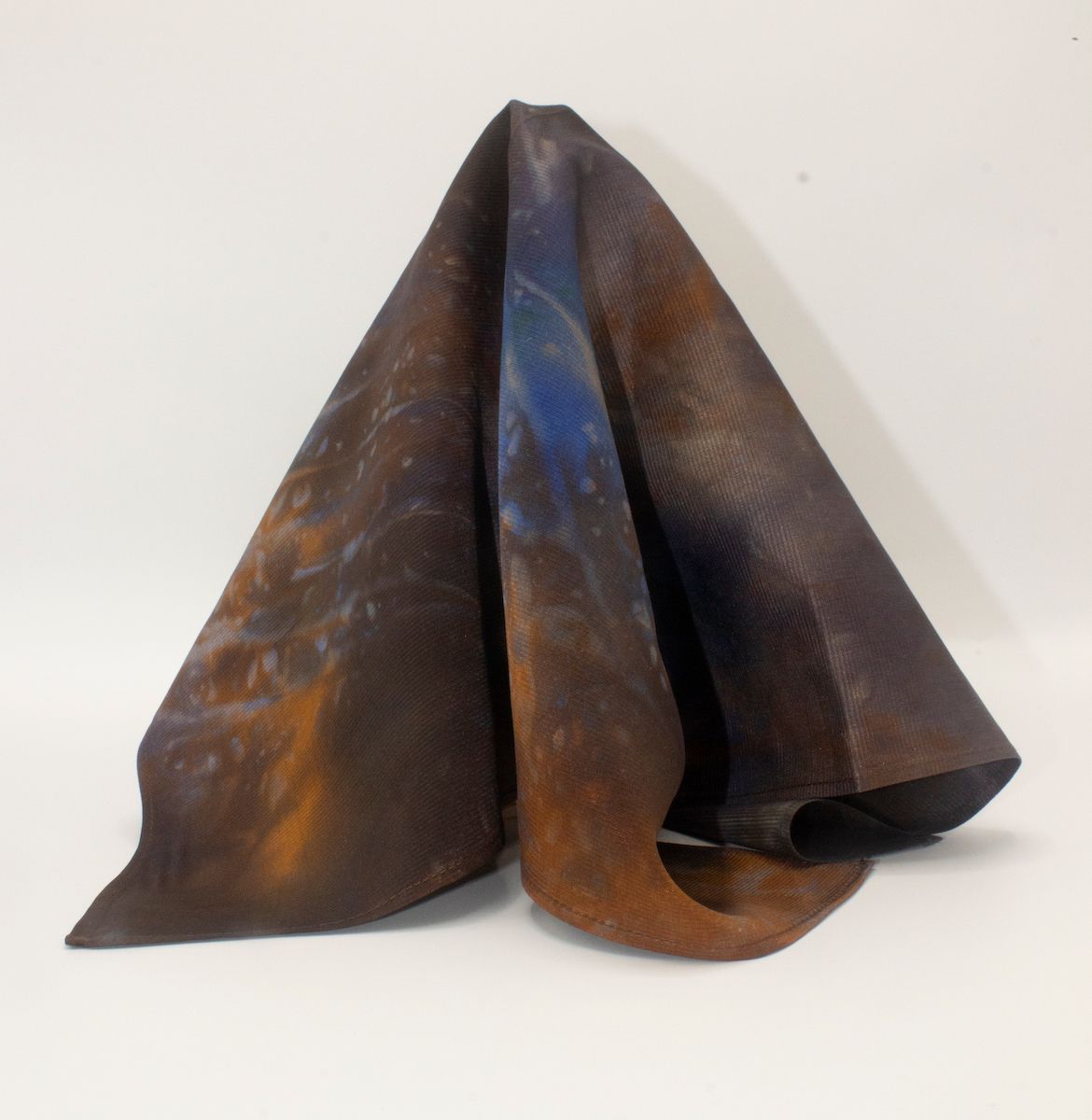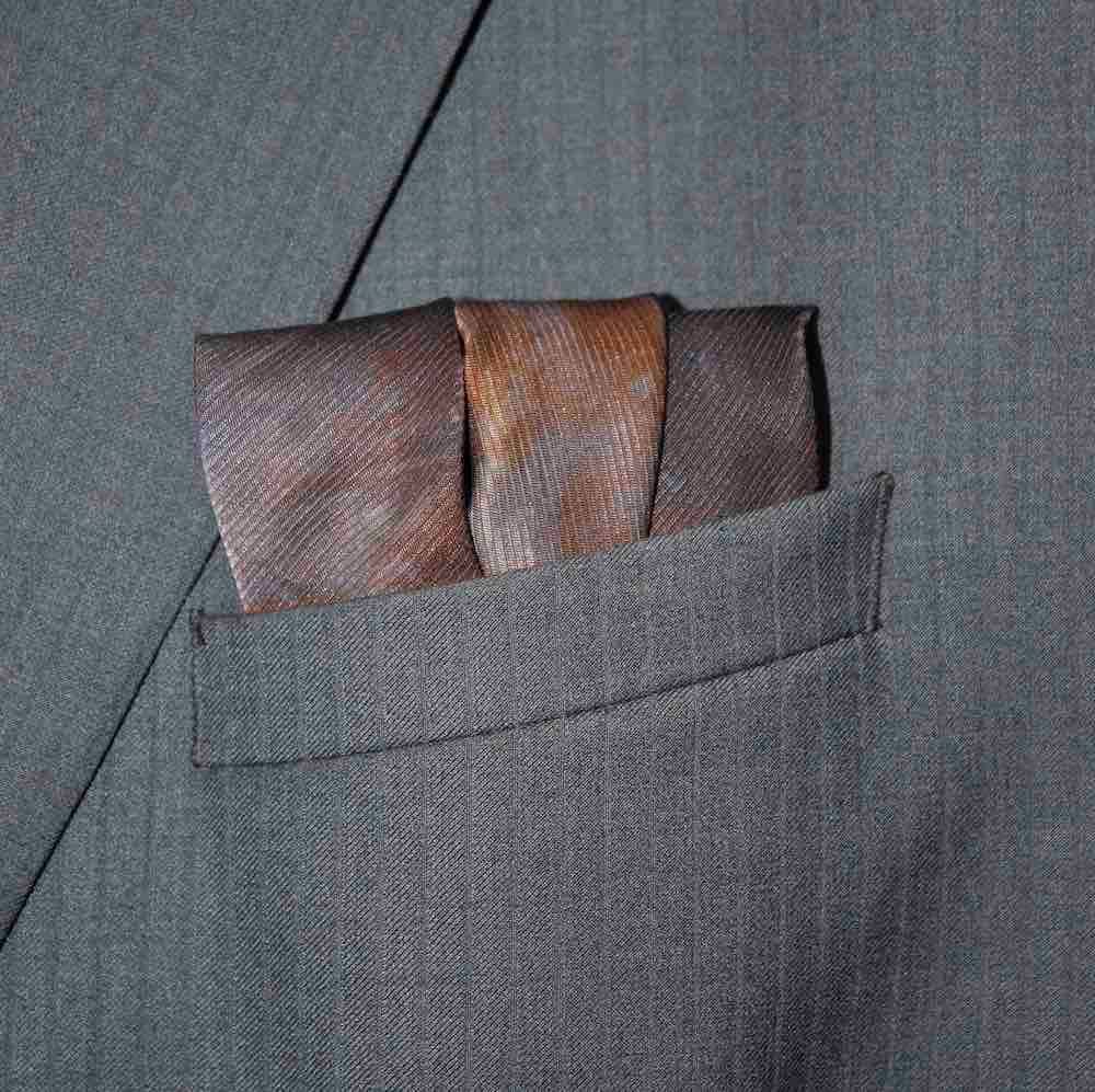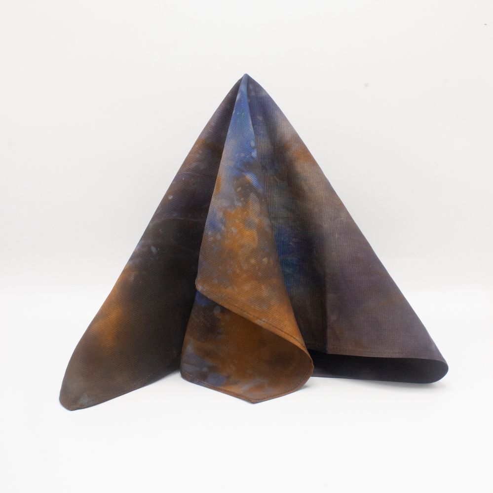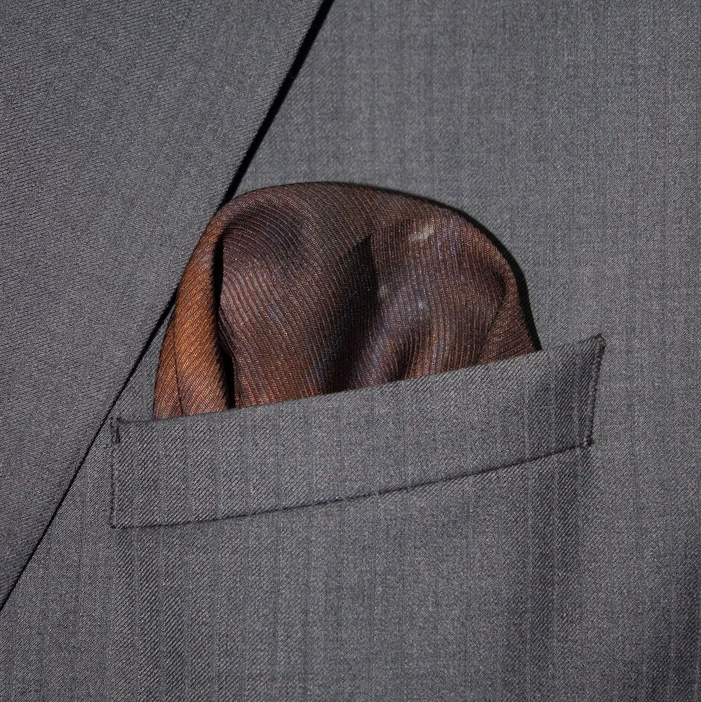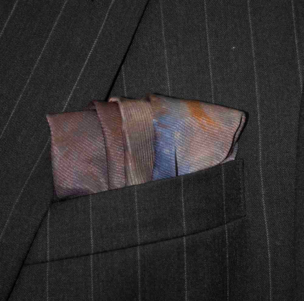 Mercurial brown silk tie-dye pocket square that is sure to mystify and impress. The colors are eminent tonal browns, accented with mustard and indigo blue, and captured in a way that you have never seen and will never see. Rich, weighty, durable 70-gm Corded Silk that has remarkable grace, form and drape. 16” square. 100% Silk. Made in India. Rarely, if ever, does this type of silk need to be washed, cleaned or ironed. Never should it be dry cleaned. Best of all, it will last forever. Worth every penny.