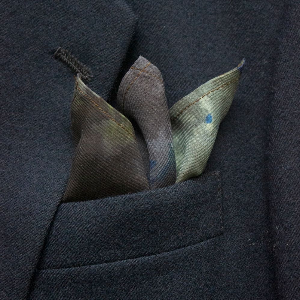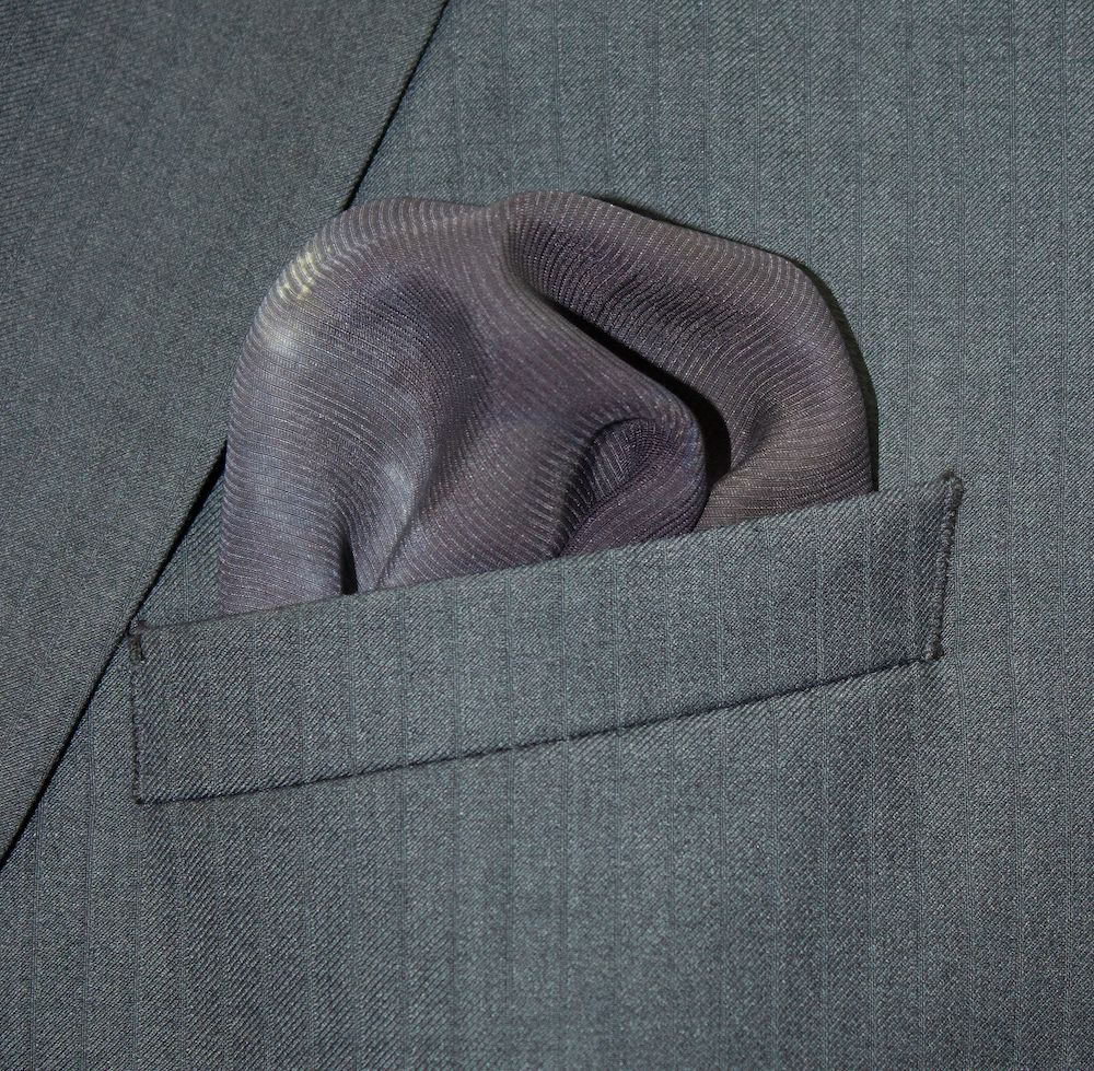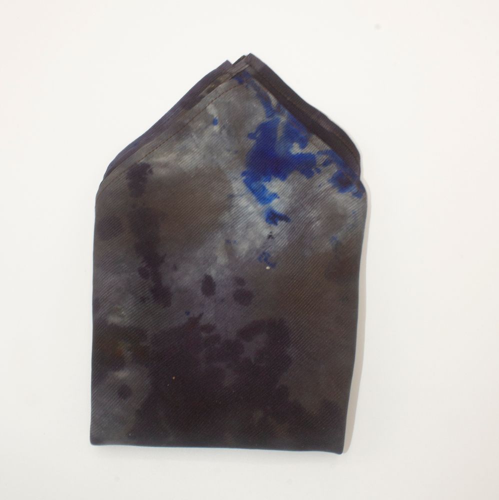 Cyclonic grey lava silk tie-dye pocket square that stands out and looks eminently unique. The colors are stormy, stone greys with a hint of indigo blue, that seem like liquefied lava that has been hardened with a rich sheen. Weighty, durable 70-gm Corded Silk that has remarkable grace, form and drape. 16” square. 100% Silk. Made in India. Rarely, if ever, does this type of silk need to be washed or ironed. Never should it be dry cleaned. Best of all, it will last forever. And worth every penny.