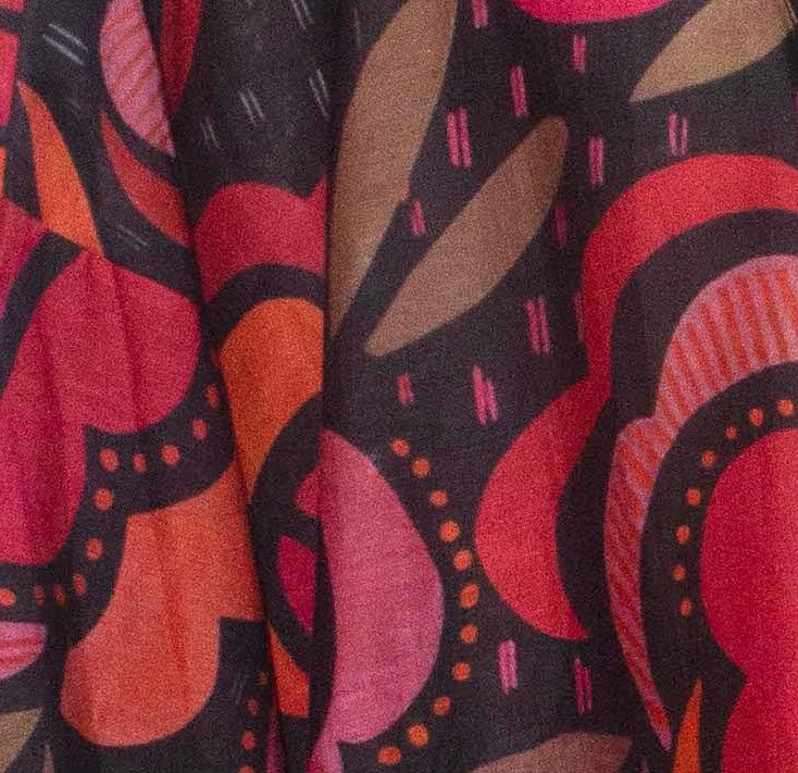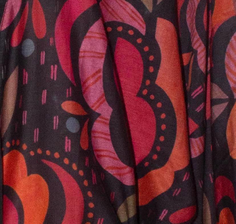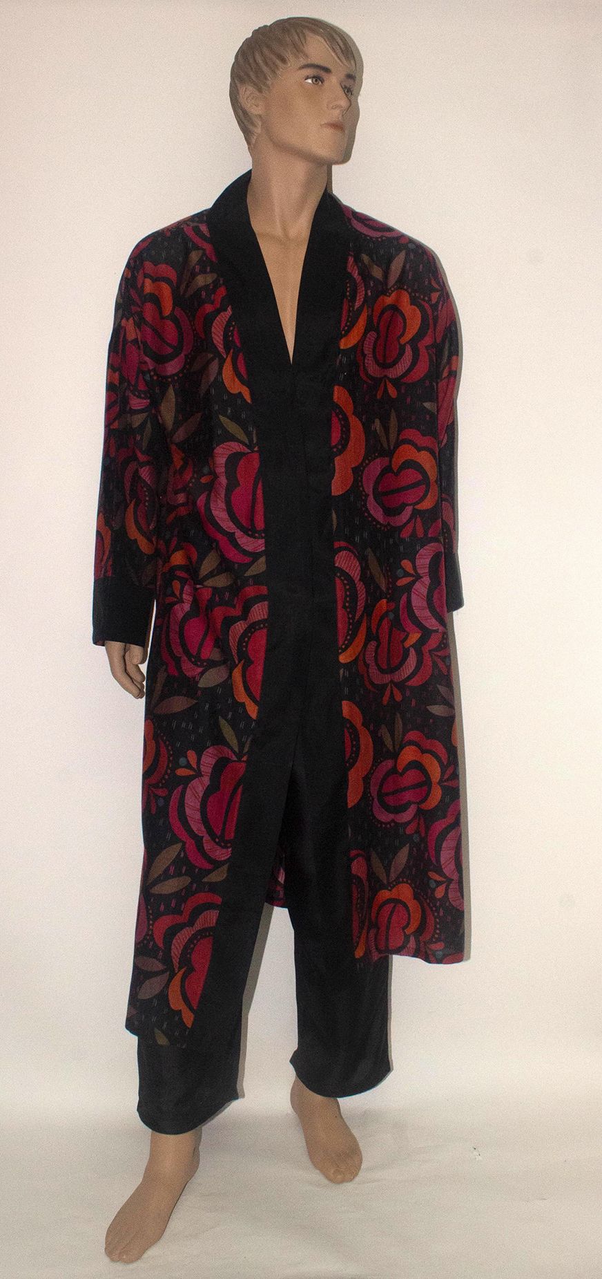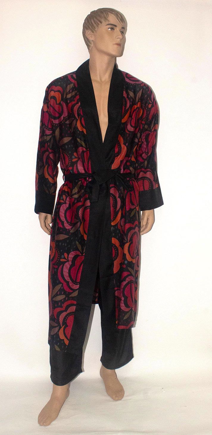 Dashing and elegant black red orchid print silk cotton kimono. Lavish, long length, about 54 inches, with 20-inch sleeves. There’s nothing like a sharp, attractive, sophisticated kimono to lift your spirits and give you the feel of high luxury and high satisfaction. Nice enough, say, for an evening lounge on the deck of a deluxe cruise liner with a glass of champagne or fine wine. Bathe yourself in this blend of silk and cotton and find out how soft, soothing and comfortable this fabric is. With two large front pockets and a sizable sash belt. One size fits all. High-quality blend of Silk, 20%, and Cotton, 80%, by Royal Silk®. Imported. No need to dry clean. This silk cotton kimono is easy to hand wash, instructions included. Or machine was with the use of our Made-in-USA Laundry Bag for silks and fine washables, that comes in two sizes, and sold separately.