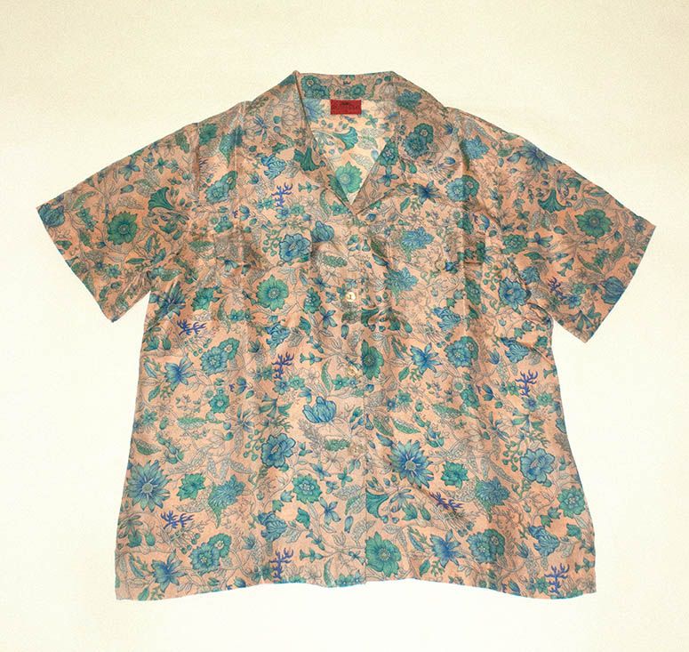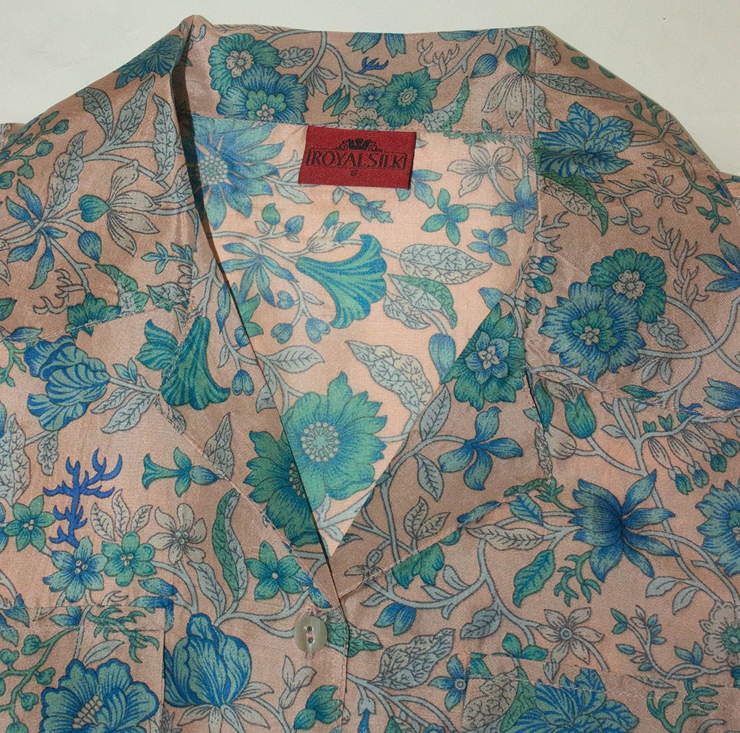 Chic women’s short-sleeve, beige blue floral print silk shirt. Short-sleeves. There’s nothing like an easy-fit, easy-to-wear, pretty, beautiful, twinkling, feminine silk print blouse to express your charm and personality. And when it’s affordable, as this is, all the more reason to own one as quickly as possible. High-quality lightweight India Silk. Button-down dress shirt with high-end details, such as: two breast pockets with a flap and a button, French seams, and classy mother-of pearl buttons. Box cut. Sizes XS to 2XL. 100% Mulberry Silk. No need to dry clean. Hand washable, instructions included. Or machine wash with the use of our Made-in-USA laundry bag for silks, available in two sizes, and purchased separately. Exclusively Royal Silk®