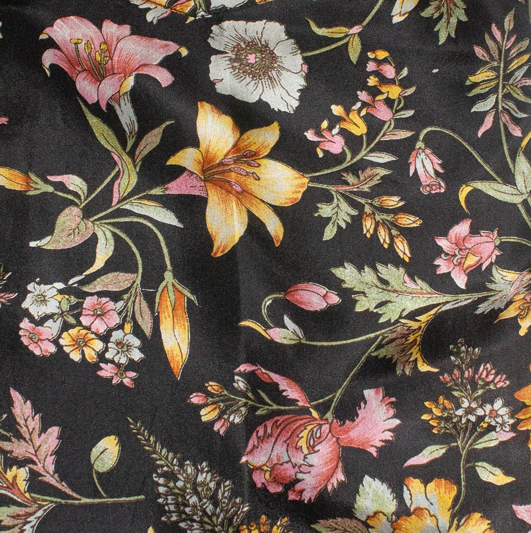 Dazzling women’s bold black floral print silk shirt. Short-sleeves. There’s nothing like an easy-fit, easy-to-wear, pretty, beautiful, twinkling, feminine silk print blouse to express your charm and personality. And when it’s affordable, as this is, all the more reason to own one as quickly as possible. High-quality lightweight India Silk. Button-down dress shirt with high-end details, such as: two breast pockets with a flap and a button, French seams, and classy mother-of pearl buttons. Box Cut. Sizes XS to 2XL. 100% Mulberry Silk. Imported. No need to dry clean. Easy to hand wash, instructions included. Or machine wash with the use of our Made-in-USA laundry bag for silks, available in two sizes, and purchased separately. Exclusively Royal Silk®