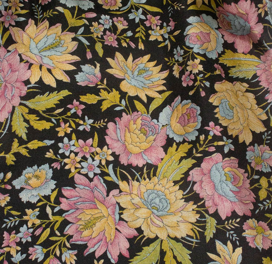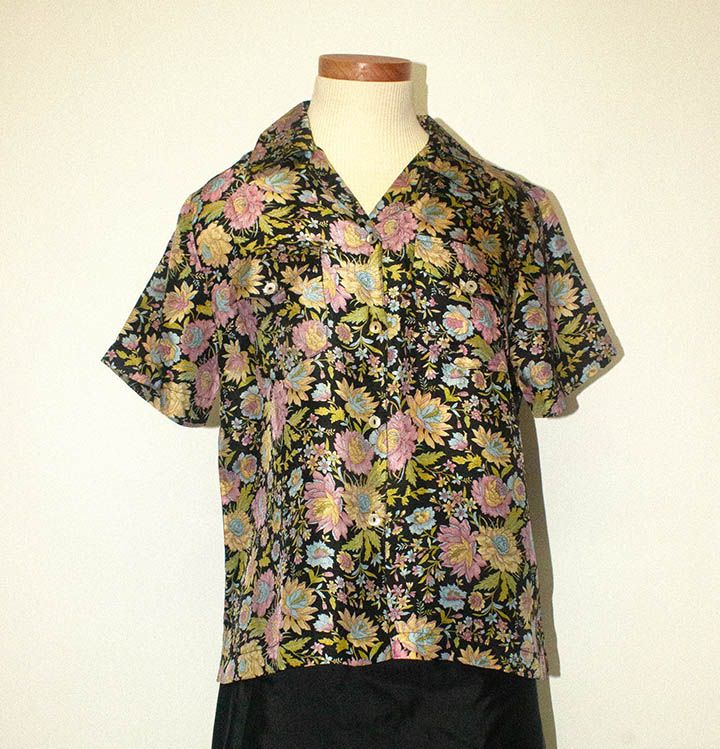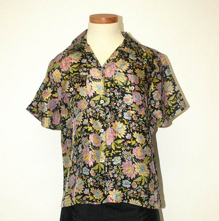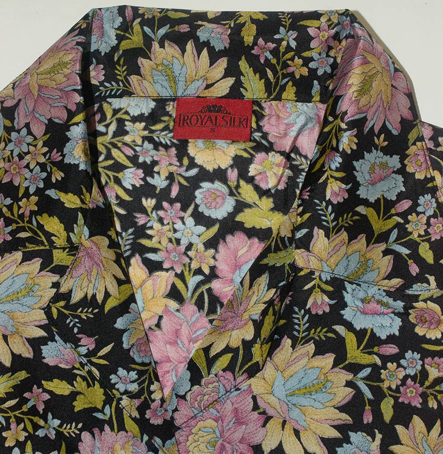 Fine women’s black pastel floral print silk shirt. Short-sleeves. There’s nothing like an easy-fit, easy-to-wear, pretty, beautiful, twinkling, feminine silk print blouse to express your charm and personality. And when it’s affordable, as this is, all the more reason to own one as quickly as possible. High-quality lightweight India Silk. Button-down dress shirt with high-end details, such as: two breast pockets with a flap and a button, French seams, and classy mother-of pearl buttons. Box cut. Sizes XS to 2XL. 100% Mulberry Silk. No need to dry clean. Hand washable, instructions included. Or machine wash with the use of our Made-in-USA laundry bag for silks, available in two sizes, and purchased separately. Exclusively Royal Silk®